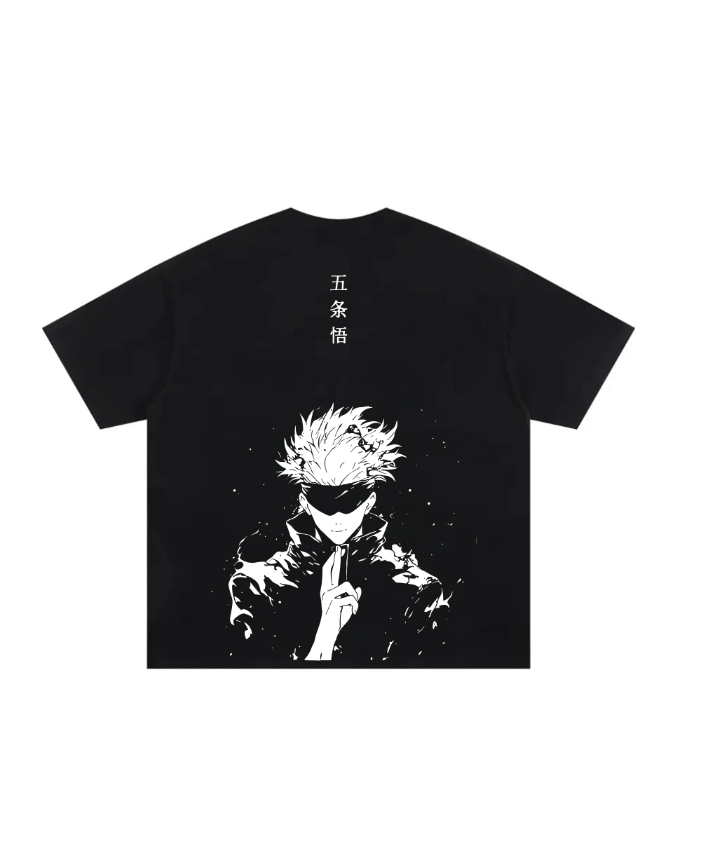 La ilustración principal en la espalda representa a Gojo en su forma más icónica, mientras que los detalles minimalistas en el frente refuerzan una estética limpia, oscura y poderosa.