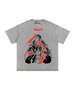 El diseño combina un frontal gráfico agresivo con un back print conceptual, cargado de simbolismo y contraste rojo, reforzando una estética oscura, rebelde y dominante.